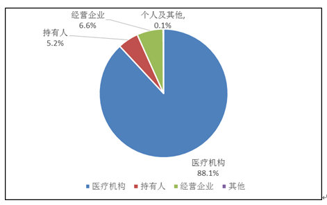 持有人、經營企業和醫療機構是藥品不良反應報告的責任單位。按照報告來源統計,2019年來自醫療機構的報告占88.1%;來自經營企業的報告占6.6%;來自持有人的報告占5.2%;來自個人及其他報告者的報告占0.1%(圖3)。
