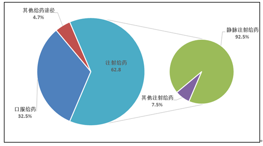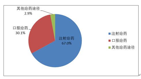 按照藥品給藥途徑統計,注射給藥占67.0%、口服給藥占30.1%、其他給藥途徑占2.9%(圖16)。注射給藥中,靜脈注射給藥占92.7%、其他注射給藥占7.3%。