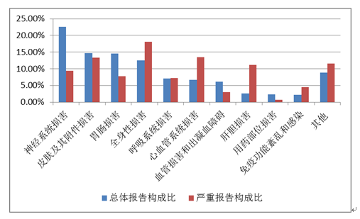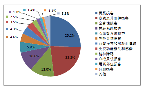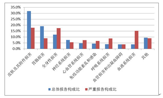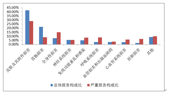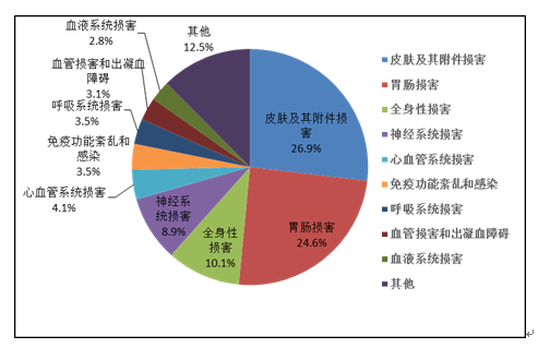 2019年國家基本藥物化學藥品和生物制品不良反應/事件報告,按照藥品類別統計,報告數量排名前5位的分別是抗微生物藥、心血管系統用藥、抗腫瘤藥、激素及影響內分泌藥、治療精神障礙藥;累及器官系統排名前5位的是皮膚及其附件損害、胃腸損害、全身性損害、神經系統損害以及血液系統損害。