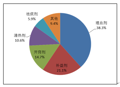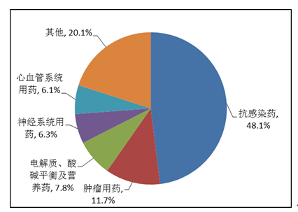 按照藥品類別統計,化學藥品占86.6%,中藥占12.6%,生物制品占0.8%。化學藥品排名居前的藥品類別是抗感染藥、心血管系統用藥、腫瘤用藥、神經系統用藥、電解質、酸堿平衡及營養藥;中藥排名居前的藥品類別是理血劑、補益劑、祛濕劑、開竅劑、清熱劑。